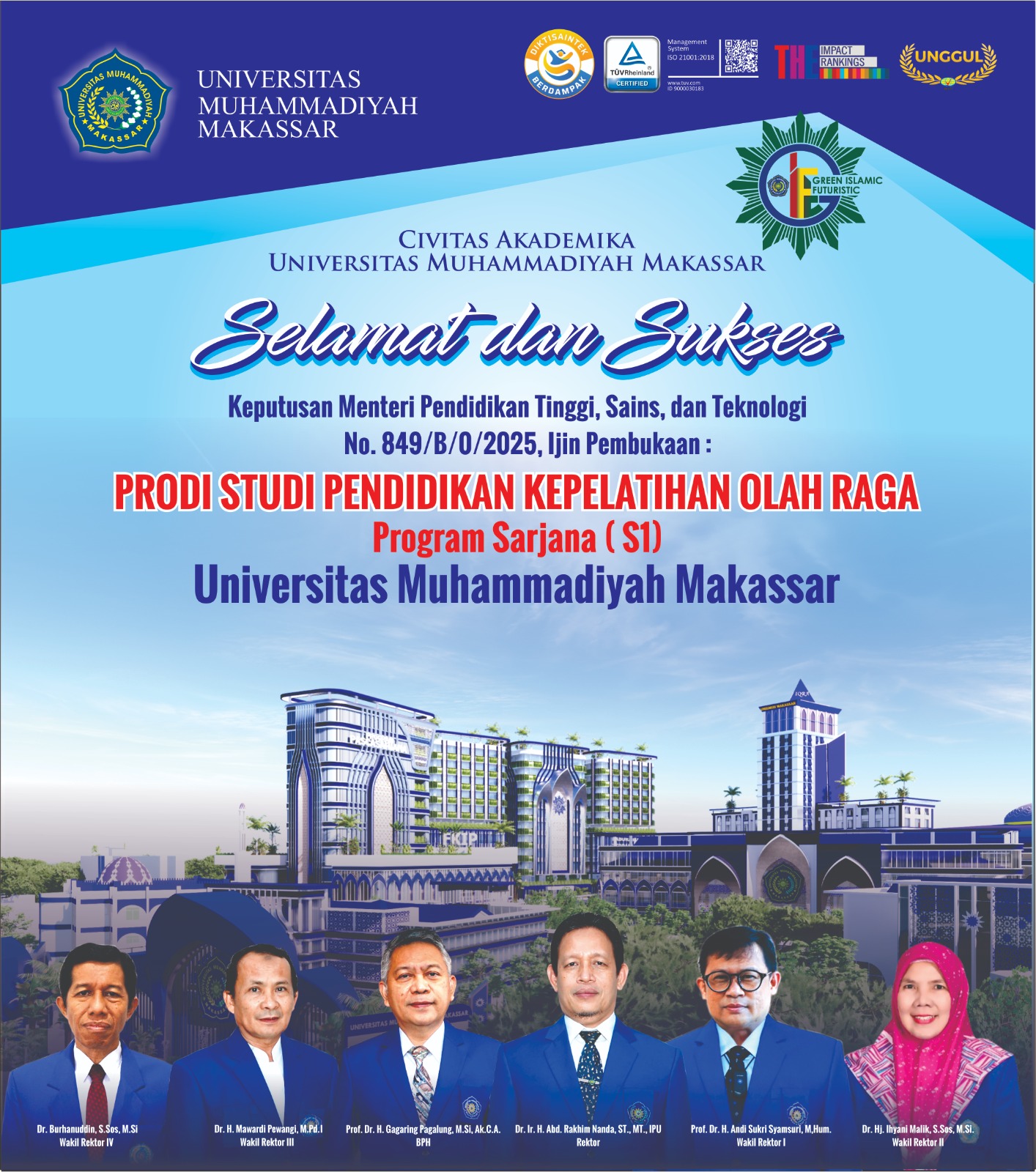 UNISMUH.AC.ID, MAKASSAR — Universitas Muhammadiyah (Unismuh) Makassar resmi membuka Program Studi (Prodi) Pendidikan Kepelatihan Olahraga jenjang sarjana. Izin pembukaan prodi tertuang dalam Keputusan Menteri Pendidikan Tinggi, Sains, dan Teknologi Nomor 849/B/O/2025 yang ditetapkan pada 3 Oktober 2025.