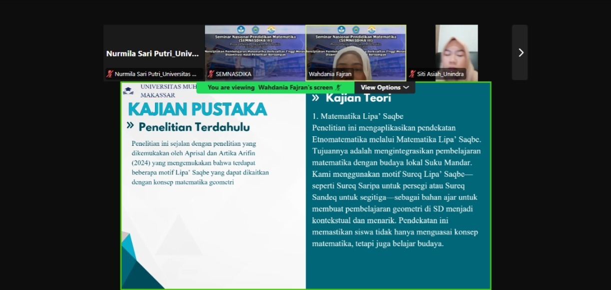 Dalam presentasinya, mereka menekankan pentingnya pembelajaran matematika yang kontekstual dan bermakna, terutama bagi siswa yang tumbuh dalam lingkungan budaya kaya simbol dan pola. Lipa’ Saqbe, kain tenun khas Bugis-Makassar, dihadirkan sebagai jembatan antara konsep geometri yang abstrak dengan realitas keseharian siswa.