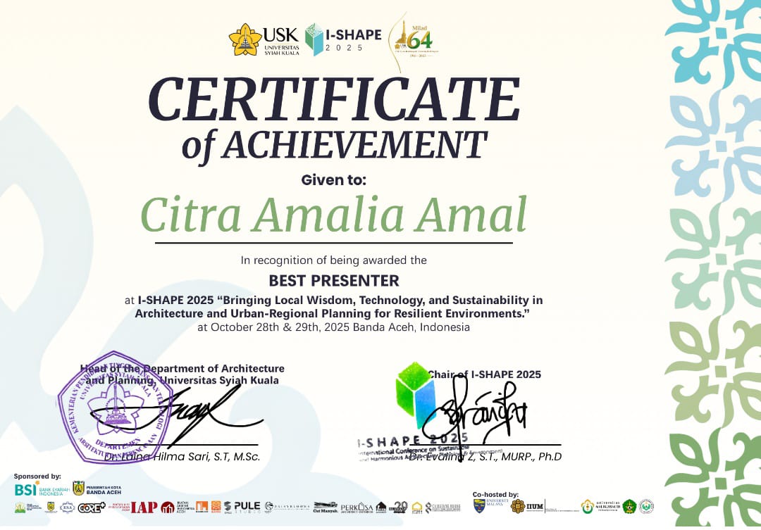 UNISMUH.AC.ID, BANDA ACEH — Dosen Program Studi Arsitektur Universitas Muhammadiyah (Unismuh) Makassar, Ar. Hj. Citra Amalia Amal, S.T., M.T., IAI, meraih penghargaan Best Presenter dalam konferensi internasional I-SHAPE 2025 (International Conference on Sustainable and Harmonious Architecture, Planning & Environment) yang digelar di Banda Aceh, 28–29 Oktober 2025.
