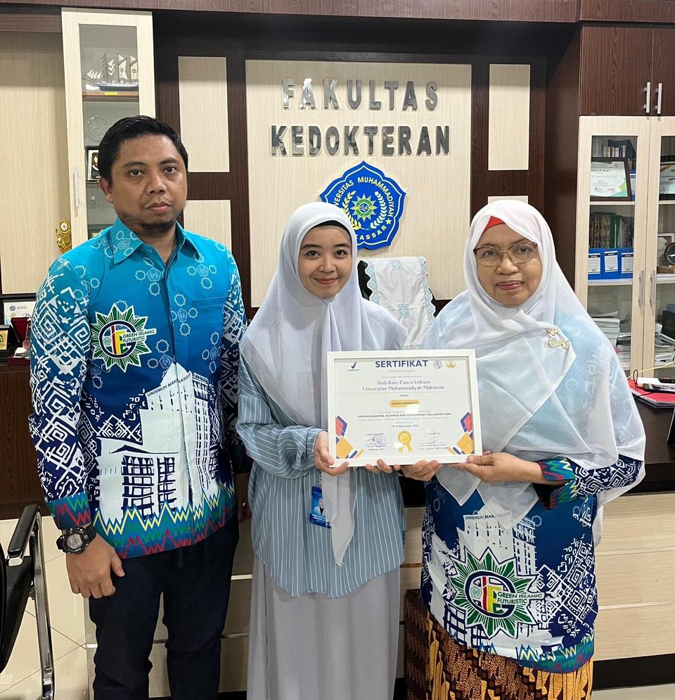 UNISMUH.AC.ID., Makassar — Andi Ratu Panca Indriani, mahasiswi profesi dokter Fakultas Kedokteran dan Ilmu Kesehatan (FKIK) Universitas Muhammadiyah Makassar, meraih Juara Harapan I pada kategori Karya Ilmiah Kompetisi Produk dalam ajang Gebyar Academia, Business, and Government Collaboration (ABG Collaboration) yang digelar Badan Pengawas Obat dan Makanan Republik Indonesia (BPOM RI). Pengumuman pemenang berlangsung di Kantor Pusat BPOM RI, Jakarta, Ahad, 16 November 2025.