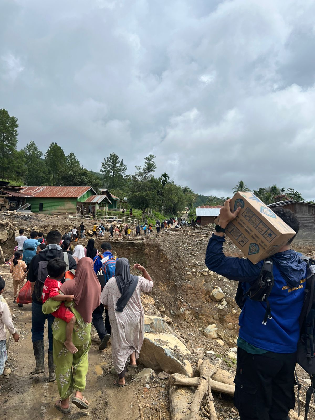 “Kondisi jalan sangat berat. Banyak titik tertutup pepohonan tumbang, tiang listrik roboh, tumpukan longsor, dan aspal yang sudah tidak lagi berbentuk jalan,” kata dr. Fahmi.