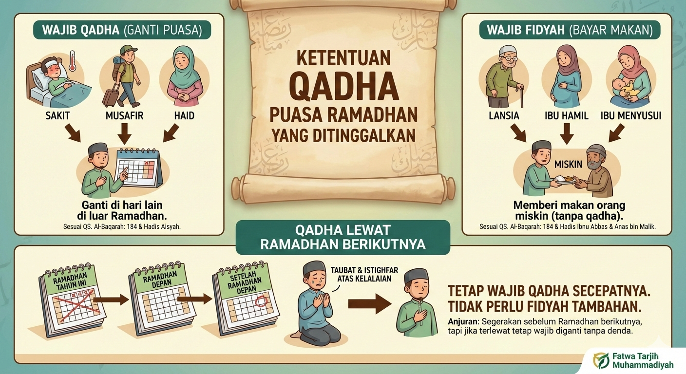 Tarjih Muhammadiyah mengurai, kelompok pertama yang mendapat rukhsah—seperti orang sakit, musafir, serta perempuan haid—tetap memikul kewajiban qadha puasa pada hari di luar Ramadhan. Sementara itu, fidyah ditempatkan pada kelompok berbeda: mereka yang “berat menjalankannya”, misalnya lanjut usia yang tidak lagi mampu berpuasa, serta disebut pula perempuan hamil dan menyusui dalam beberapa keterangan yang dikutip.