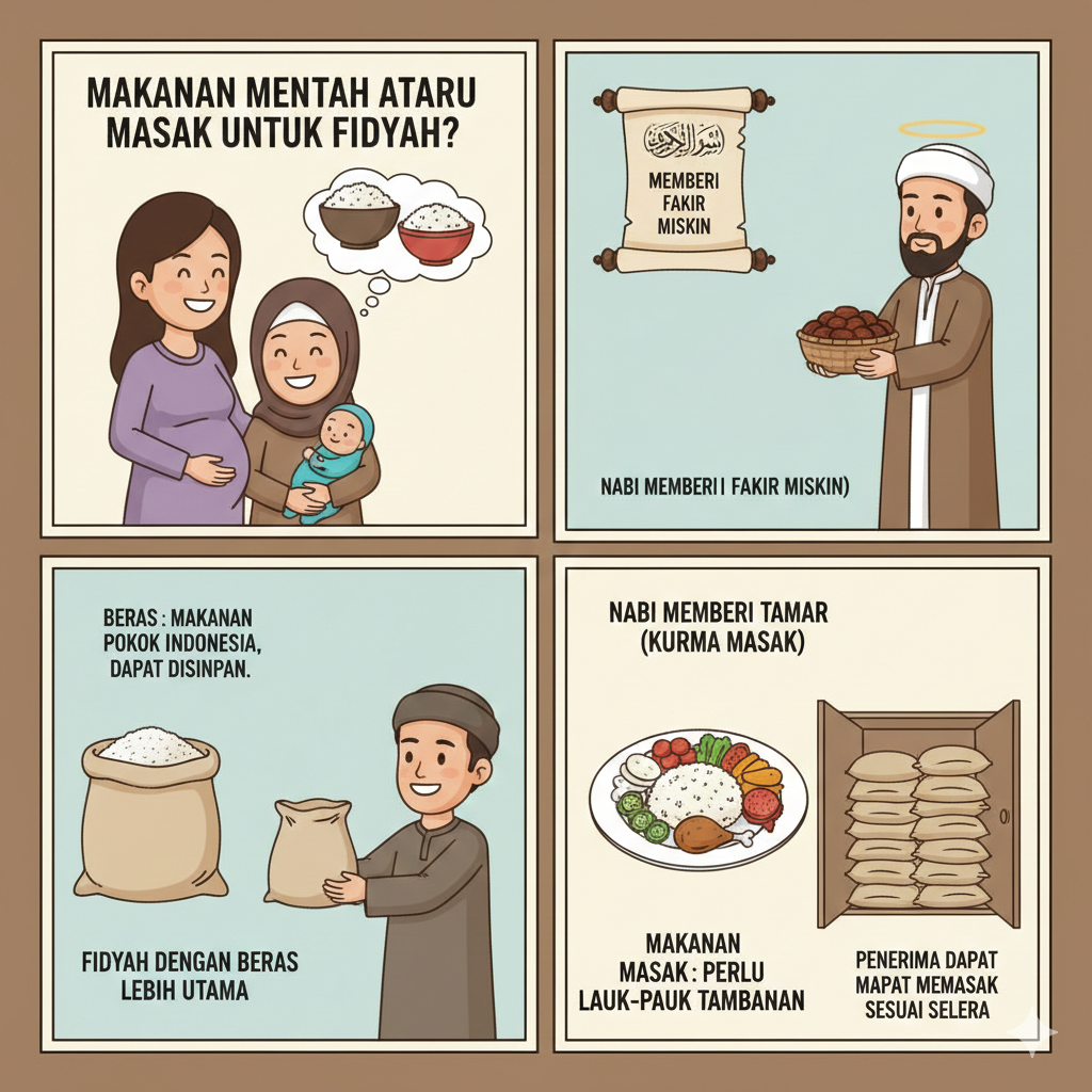 Karena itu, pemaknaan fidyah tidak dibatasi hanya pada makanan siap santap. Memberikan bahan pangan mentah seperti beras juga dibenarkan, bahkan dinilai lebih utama dalam konteks Indonesia. Beras lebih mudah disimpan, dapat diolah sesuai kebutuhan penerima, dan tidak menimbulkan keharusan tambahan lauk-pauk sebagaimana jika fidyah diberikan dalam bentuk nasi matang.