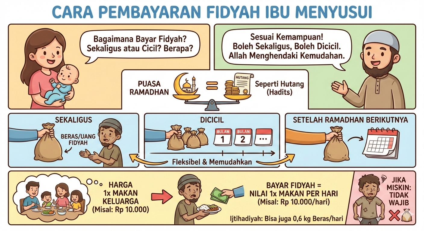 Dalam penjelasan keagamaan yang disampaikan melalui kajian fikih, pembayaran fidyah bagi ibu menyusui pada dasarnya disesuaikan dengan kemampuan masing-masing. Fidyah dapat dibayarkan sekaligus, dicicil, bahkan boleh ditunaikan setelah Ramadhan berikutnya. Prinsip ini sejalan dengan ajaran Islam yang mengedepankan kemudahan dan tidak memberatkan umat.