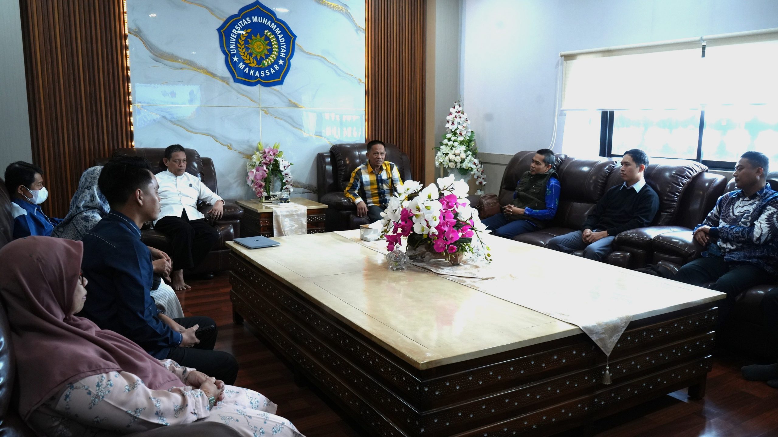 Rombongan UM Palu diterima oleh Rektor Unismuh Makassar, Dr. Ir. H. Abd. Rakhim Nanda, S.T., M.T., IPU., di Ruang Rapat Lantai 17 Menara Iqra Universitas Muhammadiyah Makassar. Setelah diterima di Lantai 17, pertemuan dilanjutkan di Aula lantai 15 Unismuh Makassar.