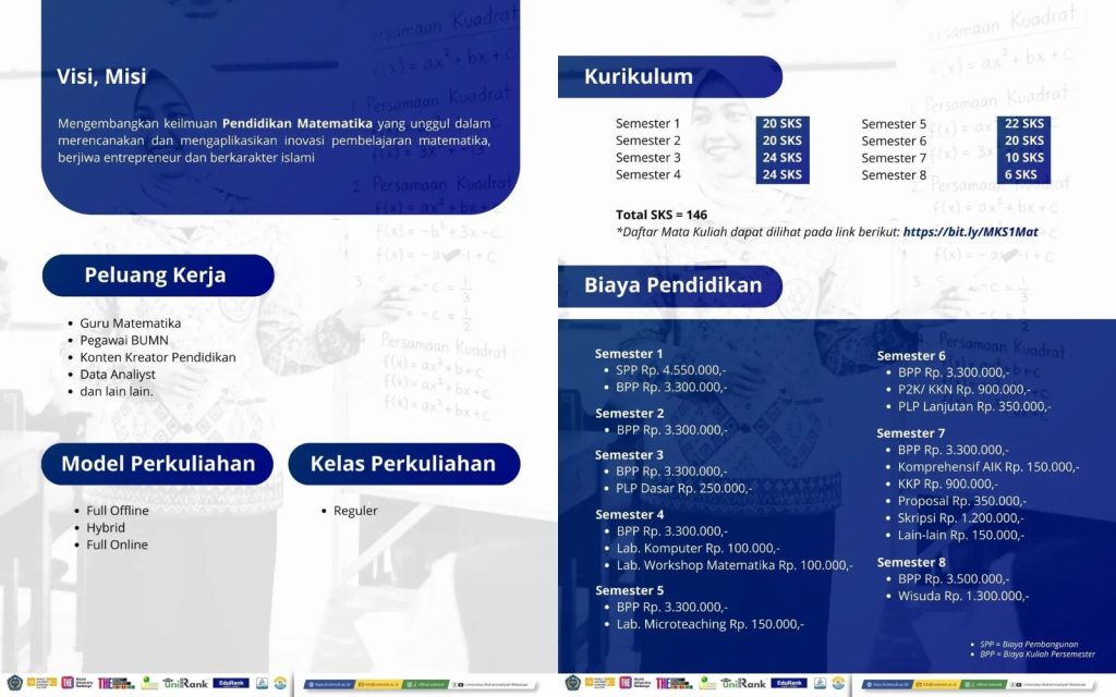 Prodi S-1 Pendidikan Matematika Unismuh Makassar membuka pendaftaran mahasiswa baru untuk periode 28 November 2025 hingga 15 Agustus 2026. Pendaftaran dapat dilakukan melalui laman resmi penerimaan mahasiswa baru pmb.unismuh.ac.id.