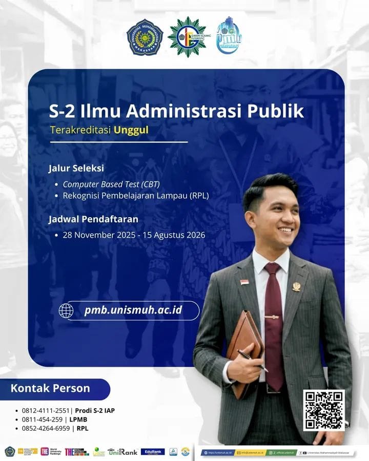 UNISMUH.AC.ID, MAKASSAR – Program Studi Magister (S-2) Ilmu Administrasi Publik Universitas Muhammadiyah Makassar (Unismuh) kembali menegaskan posisinya sebagai salah satu rujukan pendidikan kebijakan dan manajemen publik di kawasan Indonesia timur. Dengan Akreditasi Unggul, program ini dirancang untuk menjawab kebutuhan sektor publik akan sumber daya manusia yang berintegritas, berdaya analisis, dan adaptif terhadap dinamika kebijakan modern.