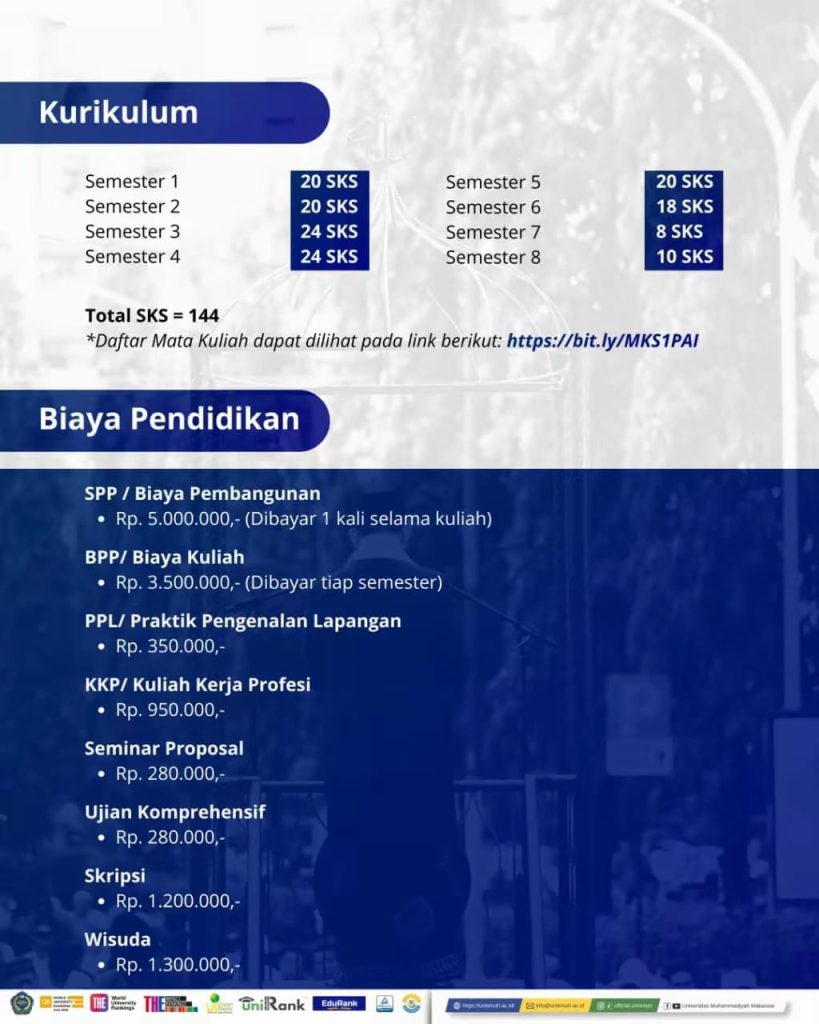 Penerimaan mahasiswa baru Prodi PAI Unismuh Makassar saat ini masih dibuka hingga 15 Agustus 2026. Pendaftaran dilakukan secara daring melalui laman resmi penerimaan mahasiswa baru universitas.