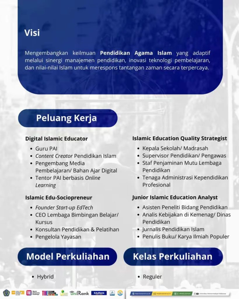Prodi ini juga membuka peluang kewirausahaan melalui pengembangan lembaga pendidikan, bimbingan belajar, hingga start-up berbasis teknologi pendidikan Islam.