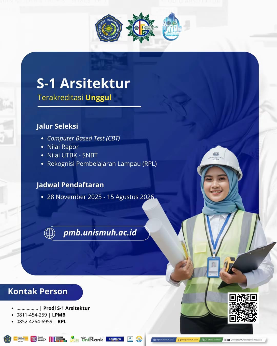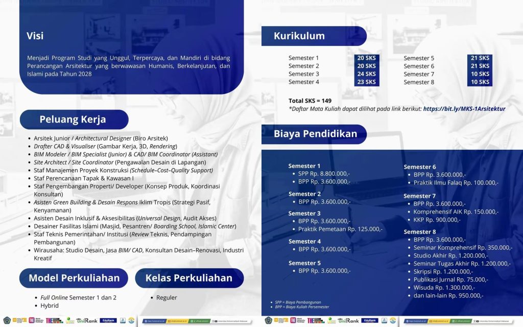 Bagi calon mahasiswa baru, Program Studi Arsitektur Unismuh Makassar membuka pendaftaran mulai 28 November 2025 hingga 15 Agustus 2026 melalui laman resmi penerimaan mahasiswa baru di pmb.unismuh.ac.id.