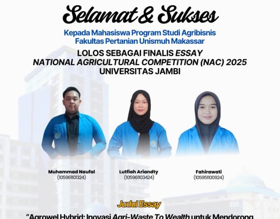 UNISMUH.AC.ID, MAKASSAR – Tim mahasiswa Program Studi Agribisnis Universitas Muhammadiyah Makassar (Unismuh) meraih juara pertama Lomba Esai National Agricultural Competition Week FAPERTA Universitas