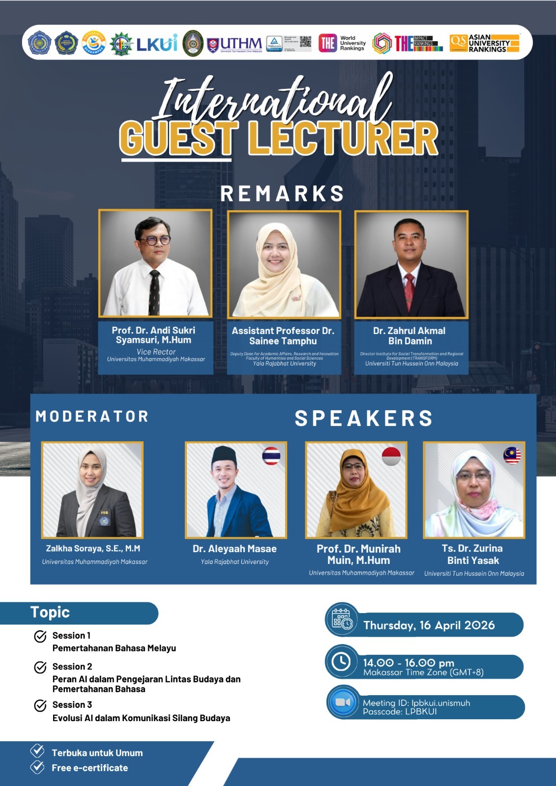 UNISMUH.AC.ID, MAKASSAR – Universitas Muhammadiyah Makassar terus memperkuat langkah internasionalisasinya melalui penyelenggaraan International Guest Lecturer dengan menghadirkan akademisi dari Asia.