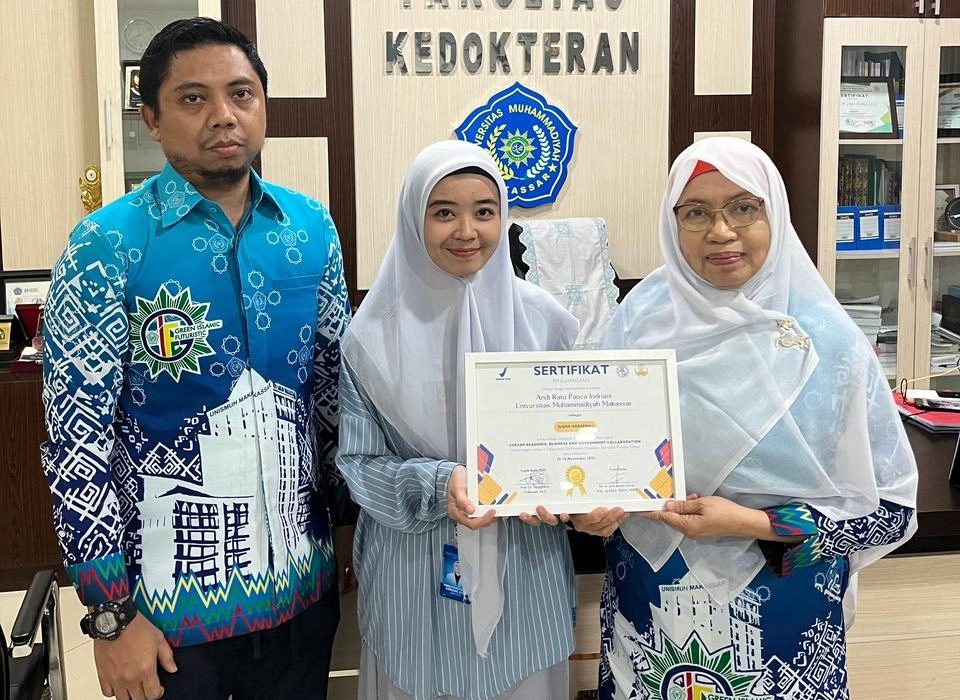UNISMUH.AC.ID., Makassar — Andi Ratu Panca Indriani, mahasiswi profesi dokter Fakultas Kedokteran dan Ilmu Kesehatan (FKIK) Universitas Muhammadiyah Makassar, meraih Juara Harapan I pada kategori Karya Ilmiah Kompetisi Produk dalam ajang Gebyar Academia, Business, and Government Collaboration (ABG Collaboration) yang digelar Badan Pengawas Obat dan Makanan Republik Indonesia (BPOM RI). Pengumuman pemenang berlangsung di Kantor