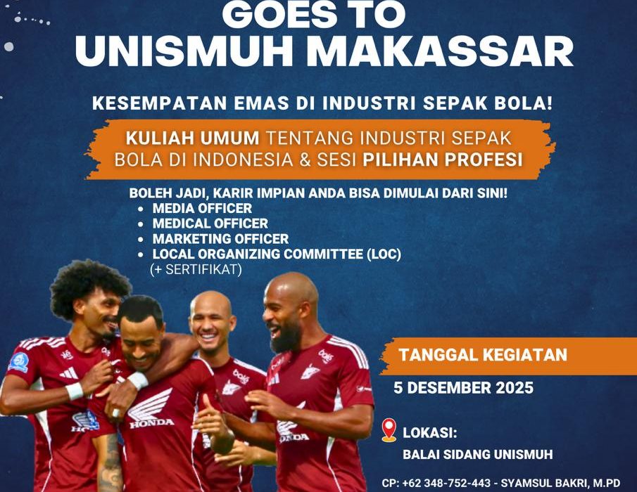 UNISMUH.AC.ID, MAKASSAR — Program I-League (Liga Indonesia) BRI Goes to Campus 2025 menyambangi Universitas Muhammadiyah (Unismuh) Makassar, Kamis 4 Desember 2025, bertempat di Balai Sidang Muktamar ke-47 Unismuh Makassar. Kegiatan ini menjadi wadah pengenalan ekosistem sepak bola kepada generasi muda, sekaligus menegaskan bahwa sepak bola hari ini telah berkembang menjadi industri dengan rantai profesi yang