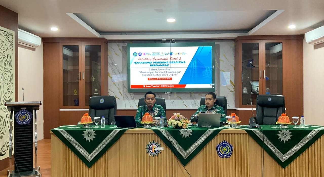 UNISMUH.AC.ID, MAKASSAR– Pelatihan Jurnalistik Gelombang II Mahasiswa Penerima Beasiswa Berdampak Universitas Muhammadiyah (Unismuh) Makassar digelar untuk memperkuat kemampuan literasi digital dan mendorong kontribusi mahasiswa melalui penulisan yang berdampak. Kegiatan ini dibuka oleh Ketua Divisi Beasiswa Lembaga Pengembangan Kemahasiswaan dan Alumni (LPKA) Unismuh Makassar, Dr. Hamzah, pada Selasa, 18 November 2025 di Aula Theatre I-Gift Unismuh