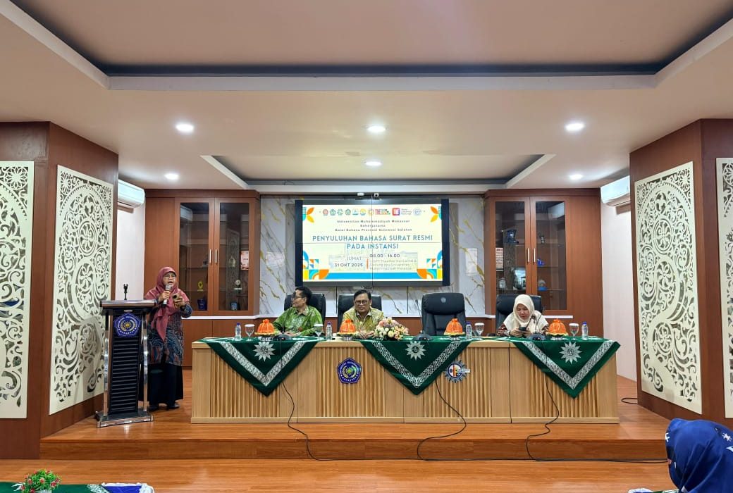 UNISMUH.AC.ID, MAKASSAR — Balai Bahasa Provinsi Sulawesi Selatan bekerja sama dengan Universitas Muhammadiyah (Unismuh) Makassar menggelar Penyuluhan Bahasa Surat Resmi.Acara diselenggarakan di Aula Teater I Gift Kampus Unismuh Makassar, Jalan Sultan Alauddin, Jumat, 31 Oktober 2025. Peserta berasal dari seluruh fakultas dan program pascasarjana, staf administrasi, kepala tata usaha, serta perwakilan sekolah Muhammadiyah, mulai dari