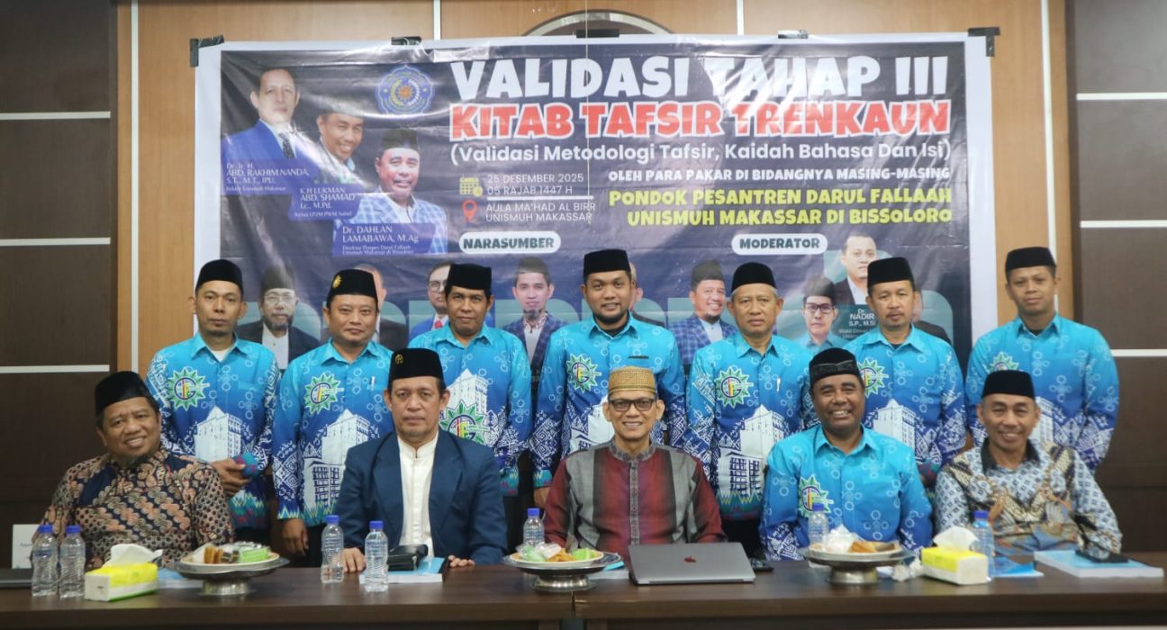UNISMUH.AC.ID, MAKASSAR — Rektor Universitas Muhammadiyah (Unismuh) Makassar, Dr. Abd. Rakhim Nanda, membuka secara resmi Validasi Tahap III Draft Kitab Tafsir “Trenkaun”, Kamis, 25 Desember 2025, di Aula Ma’had Al-Birr Unismuh Makassar. Kegiatan ini diselenggarakan oleh Pondok Pesantren Darul Fallaah Unismuh Makassar, yang juga berfungsi sebagai laboratorium pendidikan (lab school) Unismuh. Validasi tahap ketiga ini