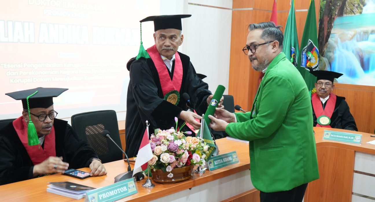 UNISMUH.AC.ID, MAKASSAR – Wakil Dekan Fakultas Hukum Universitas Muhammadiyah (Unismuh) Makassar, Auliah Andika Rukman, meraih gelar doktor setelah melewati Sidang Promosi pada Program Studi Doktor Ilmu Hukum Program Pascasarjana Universitas Muslim Indonesia (PPs UMI), Jumat, 6 Maret 2026. Dalam sidang promosi doktor itu, Andika memberikan tawaran pemikiran yang tidak semata memandang korupsi sebagai soal kerugian