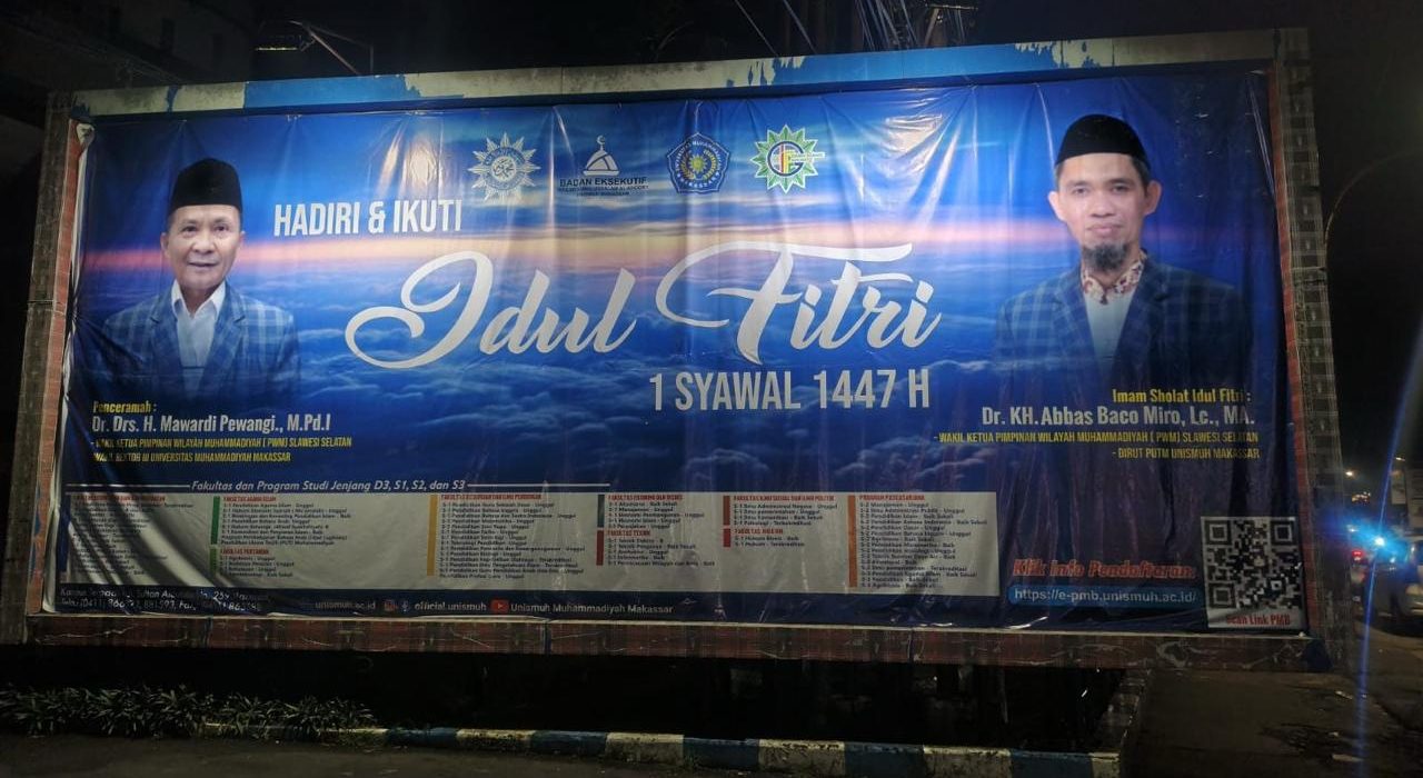 UNISMUH.AC.ID, MAKASSAR — Universitas Muhammadiyah (Unismuh) Makassar akan menyelenggarakan Salat Idulfitri 1 Syawal 1447 Hijriah pada Jumat 20 Maret 2026, di pelataran kampus utama. Wakil Rektor III Unismuh Dr KH Mawardi Pewangi yang juga Wakil Ketua Pimpinan Wilayah Muhammadiyah Sulsel dijadwalkan menjadi khatib dengan tema khutbah “Taqwa Mencerahkan Akhlak Mulia,”. Tema ini dipandang sangat relevan